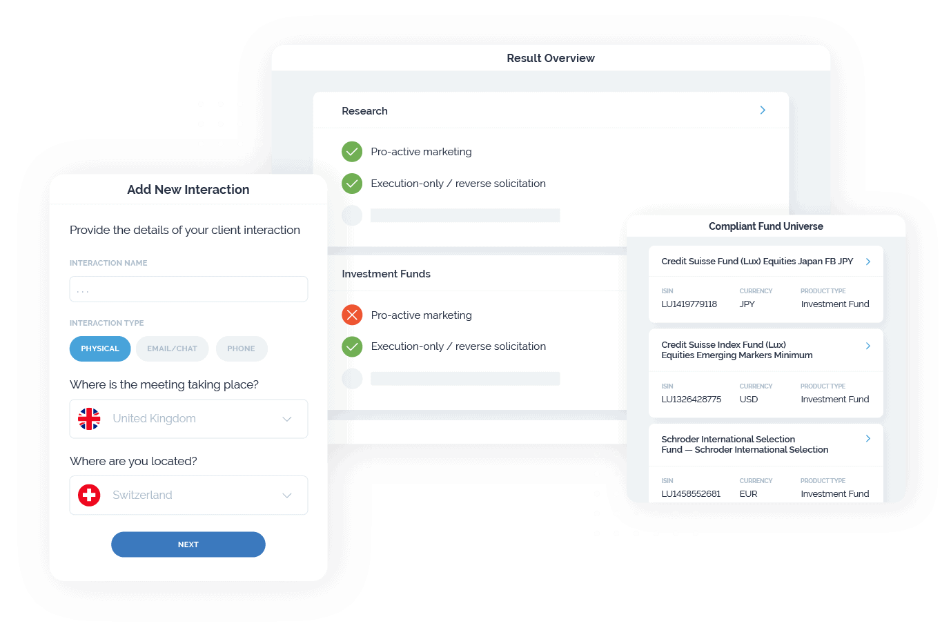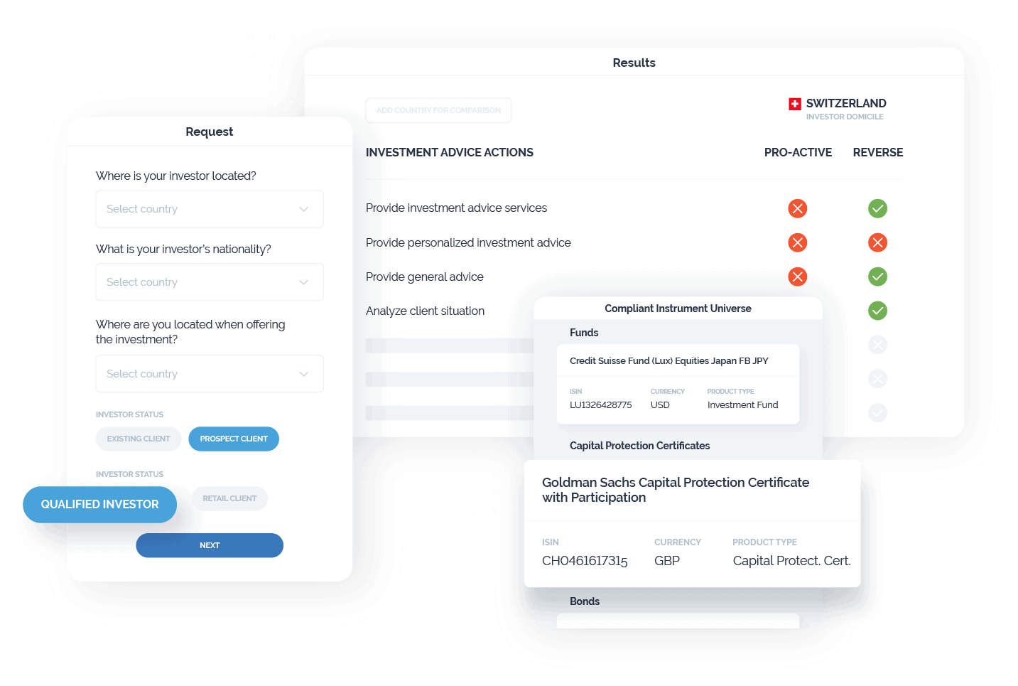 The Apiax Cross-Border App offers an alternative to paper-based manuals and compliance training. Through a simple user interface, the app provides clear yes-or-no answers to the most relevant questions in the investment advisory process and even allows to compare results across multiple jurisdictions.